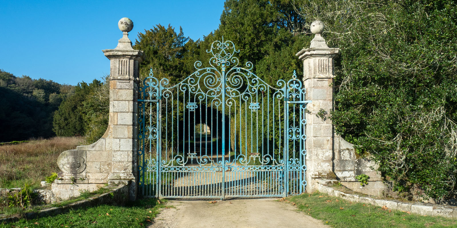 Ce portail monumental en fer forgé est installé entre 1882 et 1885 par Léon Lorois alors propriétaire du domaine, il fait marquer ses initiales, les deux L entrecroisés au sommet du portail. C’est à Léon Lorois que l’on doit la transformation de l’abbaye en château aujourd’hui disparu et le rétablissement du pardon de Saint-Maurice en 1884.
